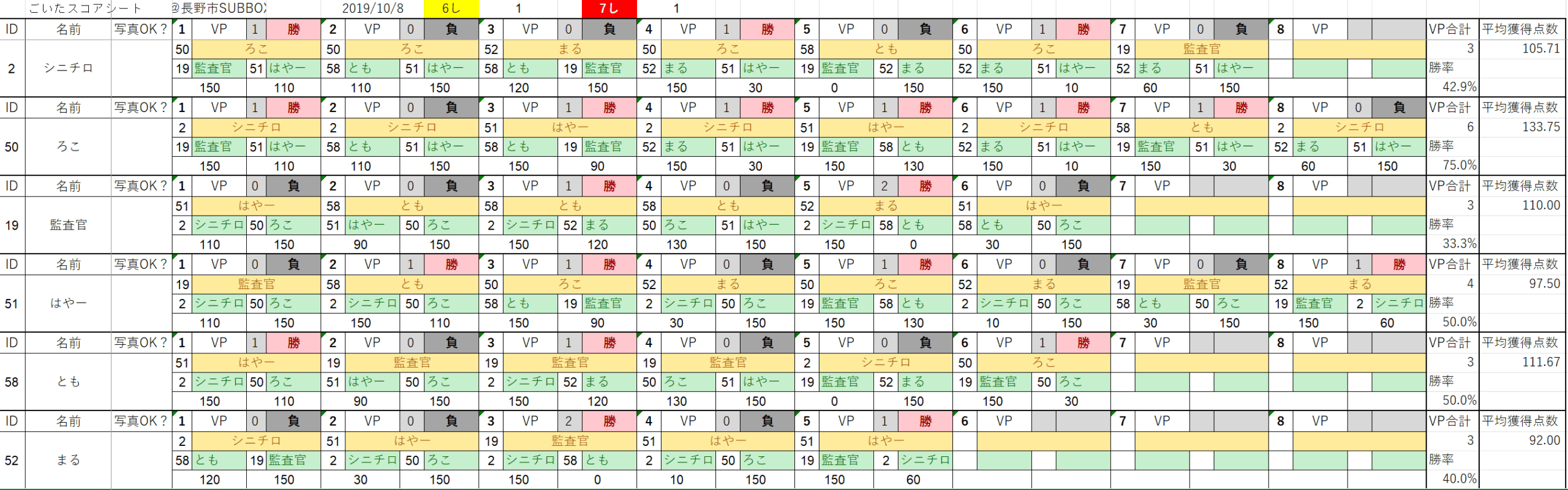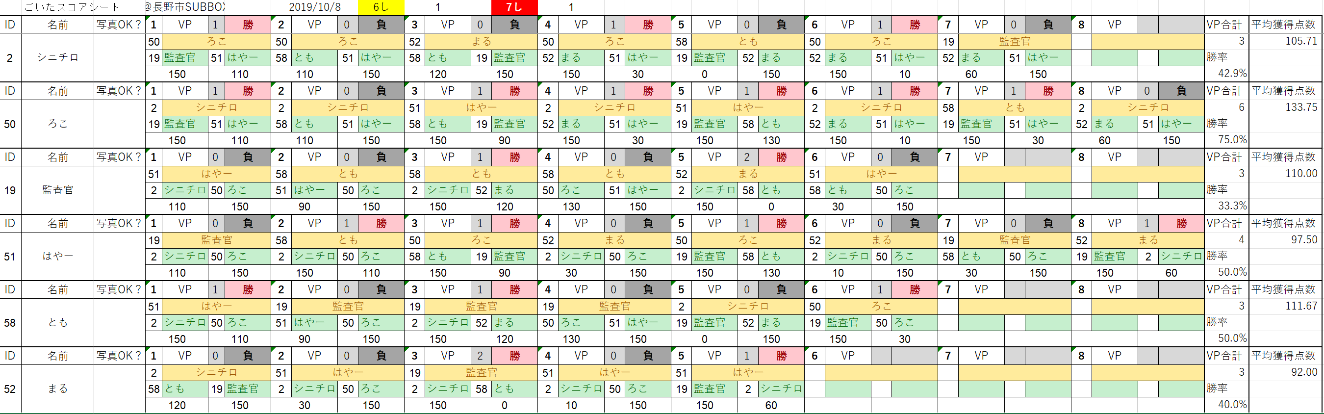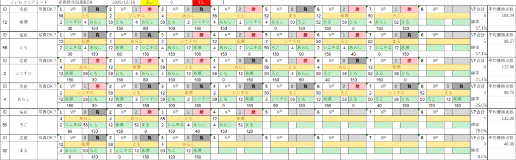通算勝利数、通算VP…シーズン合計での勝利数、VP(勝利した人に1点)数となります。当会ではどろ勝ち(150-0)をしたチームメンバーにはそれぞれ2点を付与するルールとしています。